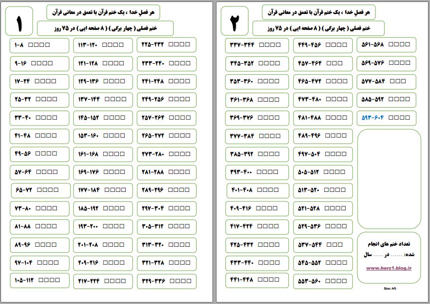 *** این عکس فقط نمونه است ، لطفا فایل PDF را در سایر A/5 ، به صورت پشت و رو ( در یک برگه ) پرینت بگیرید و ان شاالله هر فصل عمرتان ، یک بار قرآن ( قرآن عثمان طه ) را ختم کنید. ***
